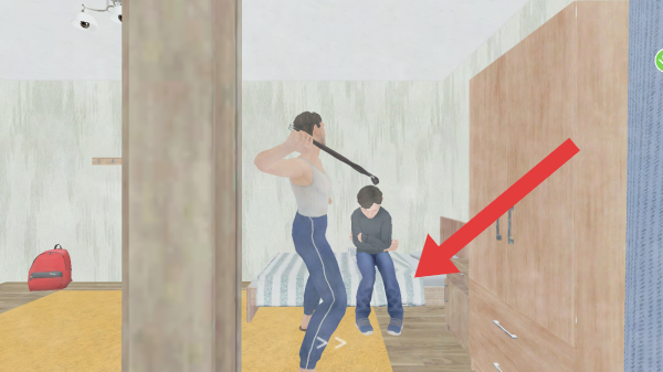3、显示一名成年角色手持物品,在对少年角色采取行动,红色箭头所指是玩家可探索或逃离的方向,比如打开柜子查看有无道具。
