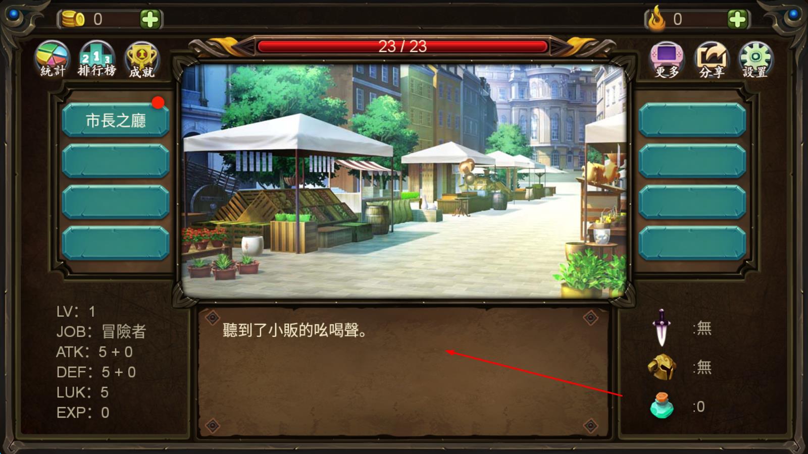 1、创建角色后进入城镇街道,点击两侧按钮熟悉环境,尝试首个工作获取金币,再通过右下角“门”按钮选择副本,开启首次冒险。