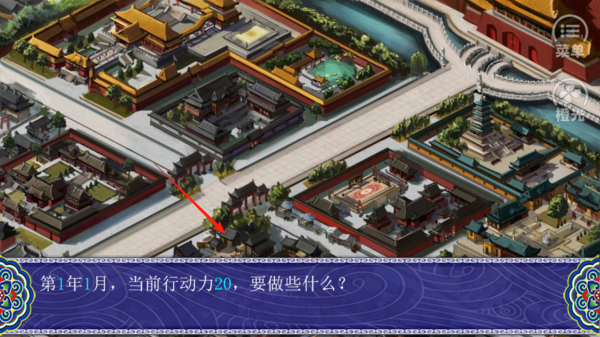 3、依据行动力数值规划行动,选择建筑,决定第1年1月行动,推进游戏进程,体验策略规划机制。