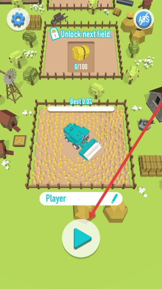 1、进入游戏主页面中,点击农田界面底部蓝色三角形按钮,启动收割机,开始农田收割作业。