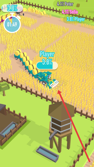2、在收割场景中,按照箭头指示,通过滑动屏幕操控收割机移动,在麦田里尽可能多地收割麦子。
