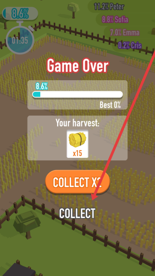 3、在失败后进入游戏结束界面,点击COLLECT按钮,领取本次收割获得的麦子奖励,结算收益。