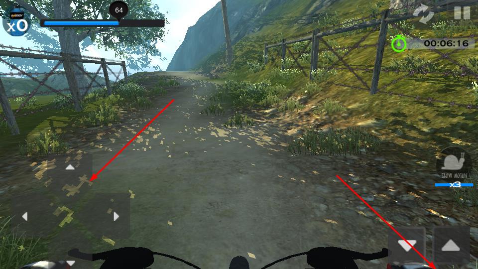 2、在骑行关卡,操控虚拟按键控制自行车方向,沿山路骑行,留意路径与时间进度。