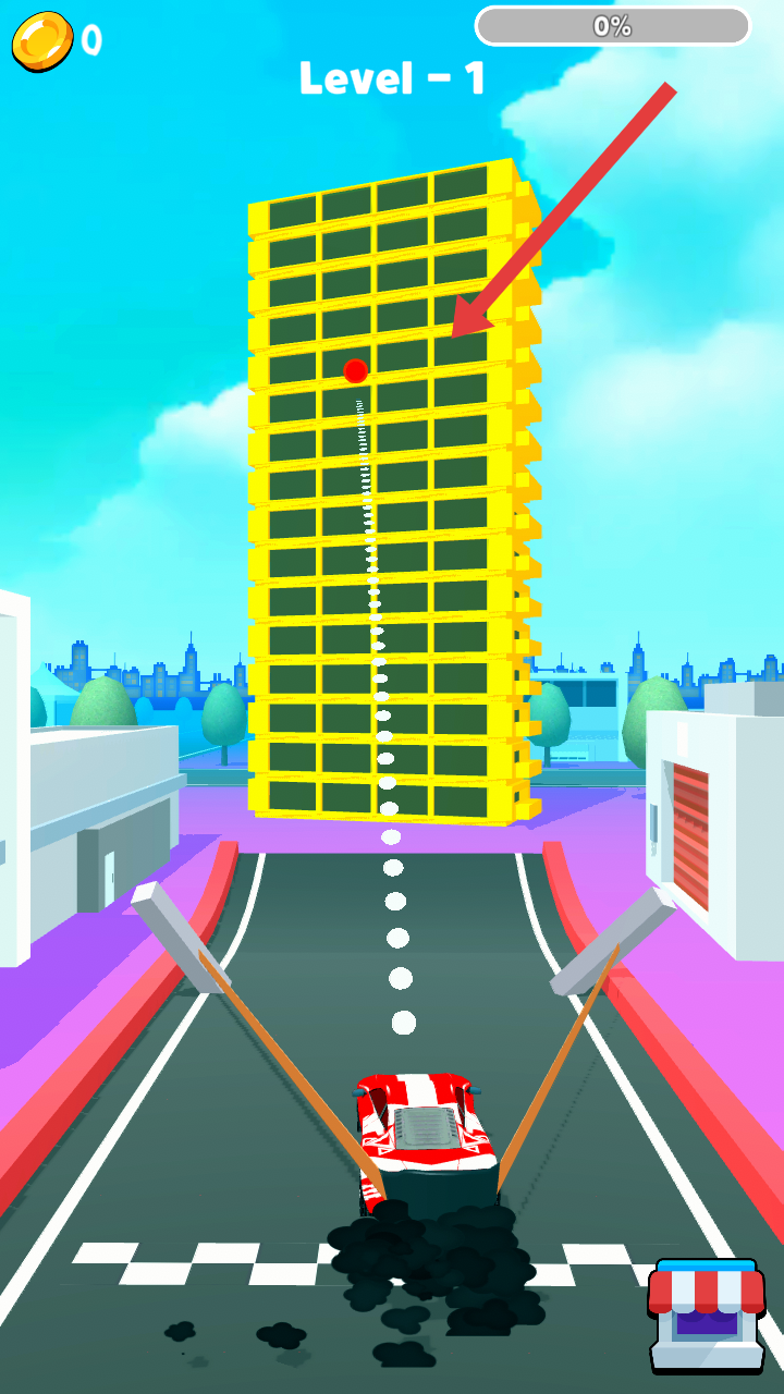 1、进入游戏Level1关卡,需要后拖来进行操控汽车对准黄色大楼进行粉碎,通关撞击得分。