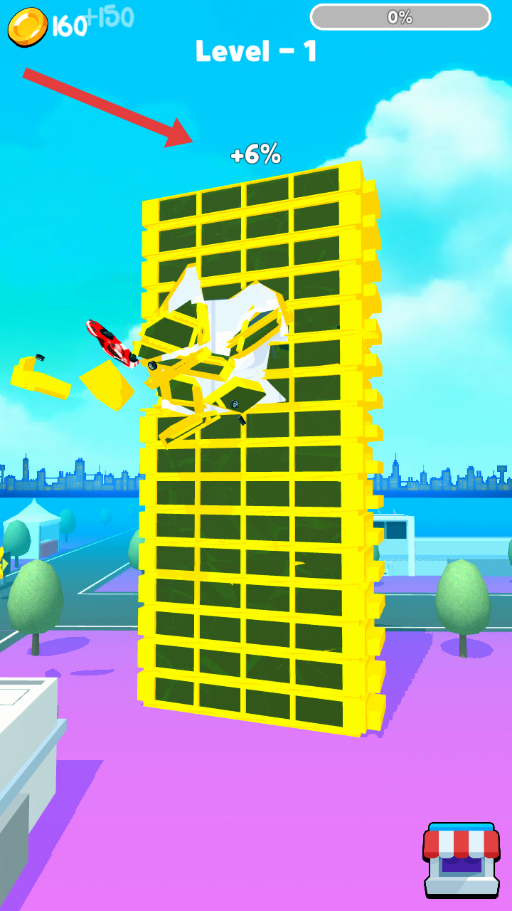 2、在车辆撞击大楼的过程中,破坏大楼可以获金币,如画面+6%所示,需要持续撞击积累破坏进度。