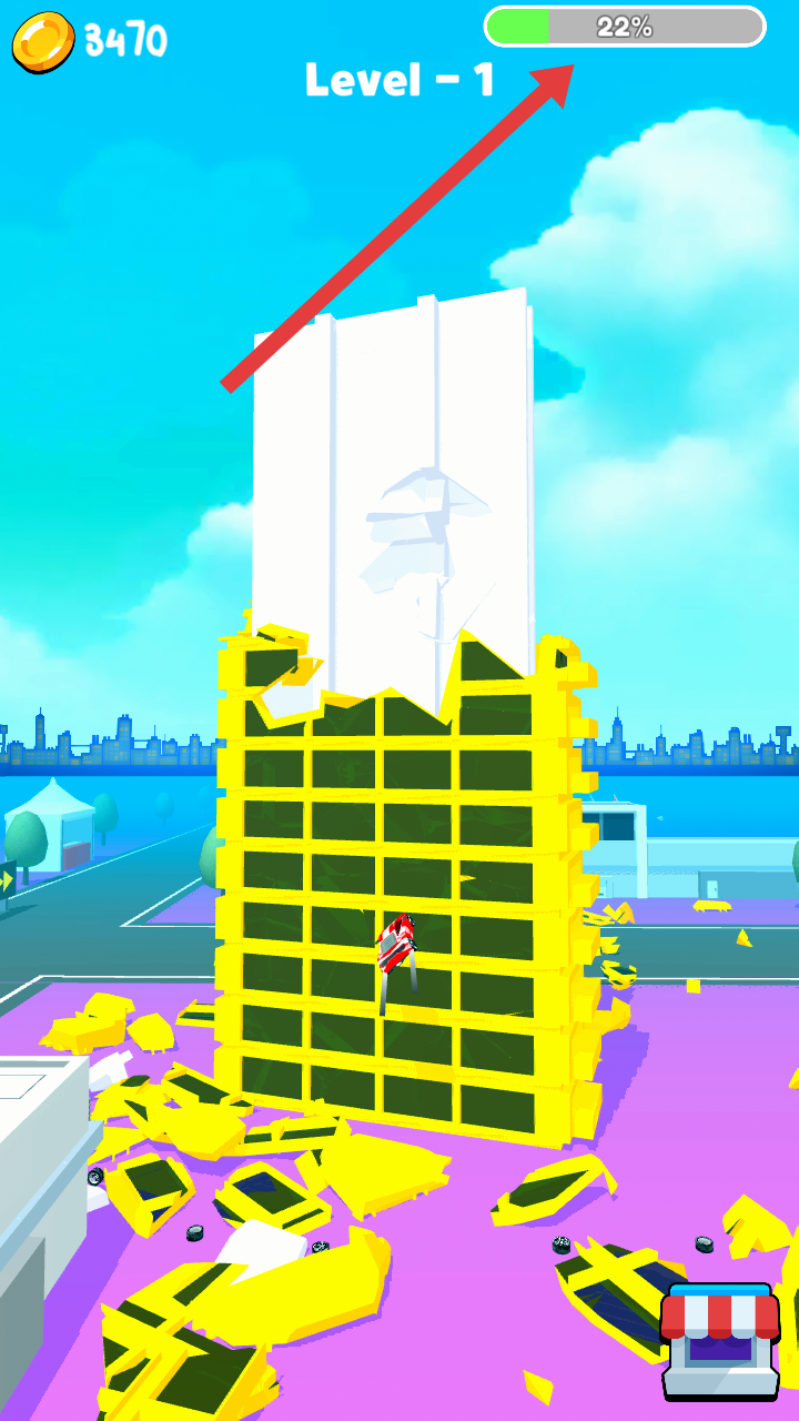 3、需要时刻关注顶部的进度条,持续的撞击大楼,直至进度条充满,完成Level1的破坏任务。