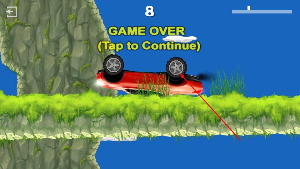 3、若汽车翻车出现GAME OVER,点击屏幕可继续游戏,重新挑战关卡,争取顺利通关。