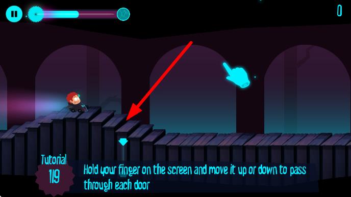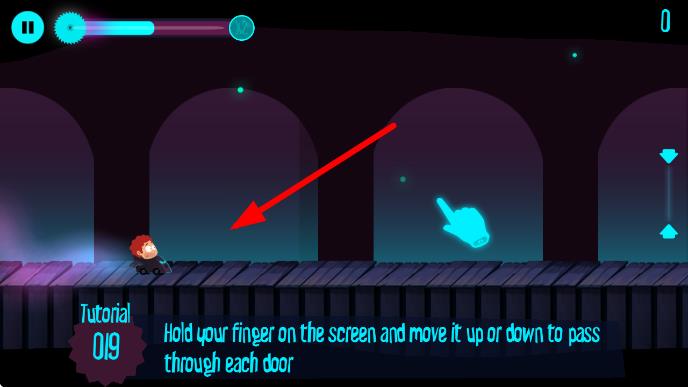 2、在教程关卡,按照提示 ,长按屏幕并上下移动,控制角色通过拱门,熟悉操作方式。