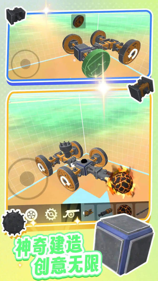 1、创新的自由建造系统提供超过多种基础模块,从简单的方块到复杂的机械零件,所有模块都支持自由旋转和任意拼接。