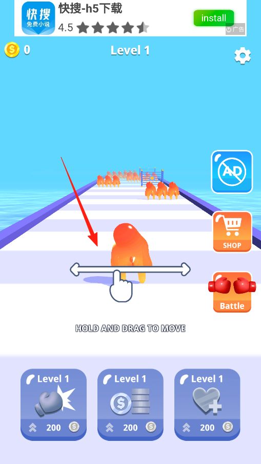 1、按住并拖动,控制角色移动,在跑道上躲避障碍,收集金币向终点前进,体验移动操控机制。