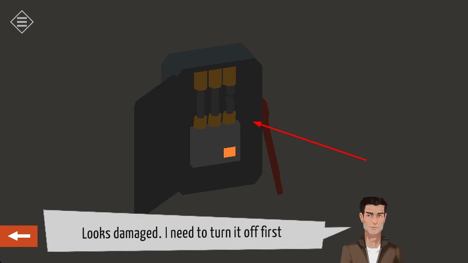 2、遇到损坏设备如提示Looks damaged. I need to turn it off first的装置,根据指引探索场景,寻找关闭设备的方法,查看解谜流程。