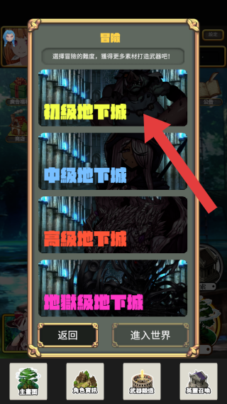 2、包含初级地下城、中级地下城、高级地下城、地狱级地下城这些副本,以及引导文字选择冒险的难度,猎得更多素材打造武器吧。