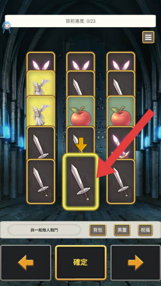 3、目标进度0/23,界面中展示了武器、苹果等物品的格子布局,呈现出玩家在进行装备选择配置的环节。