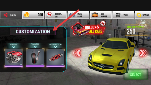 1、进入车辆改装界面CUSTOMIZATION,可以选择消耗金币来进行升级引擎、轮胎、悬挂等部件。