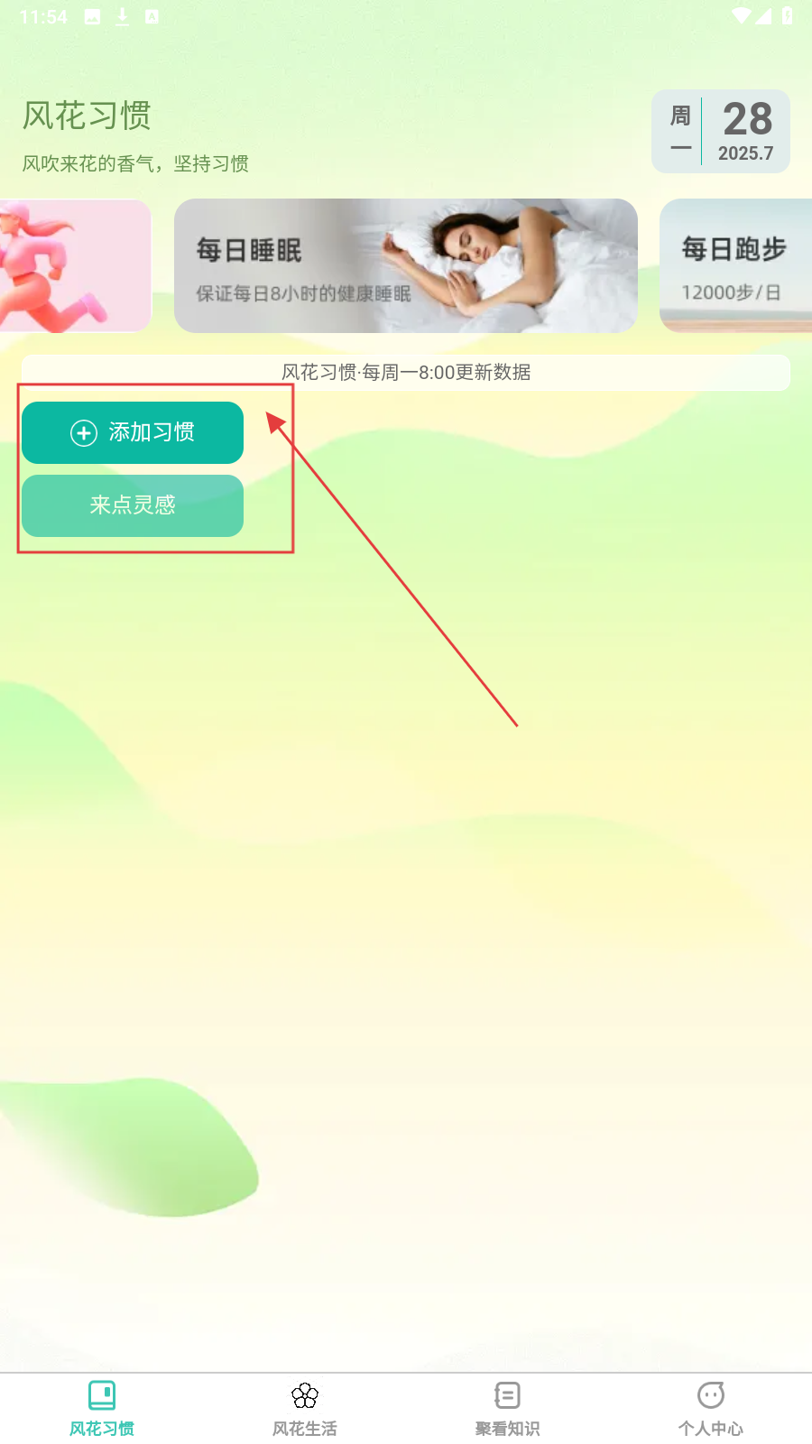 1、打开APP进入【风花习惯】页,点击【添加习惯】,开启新习惯创建流程。