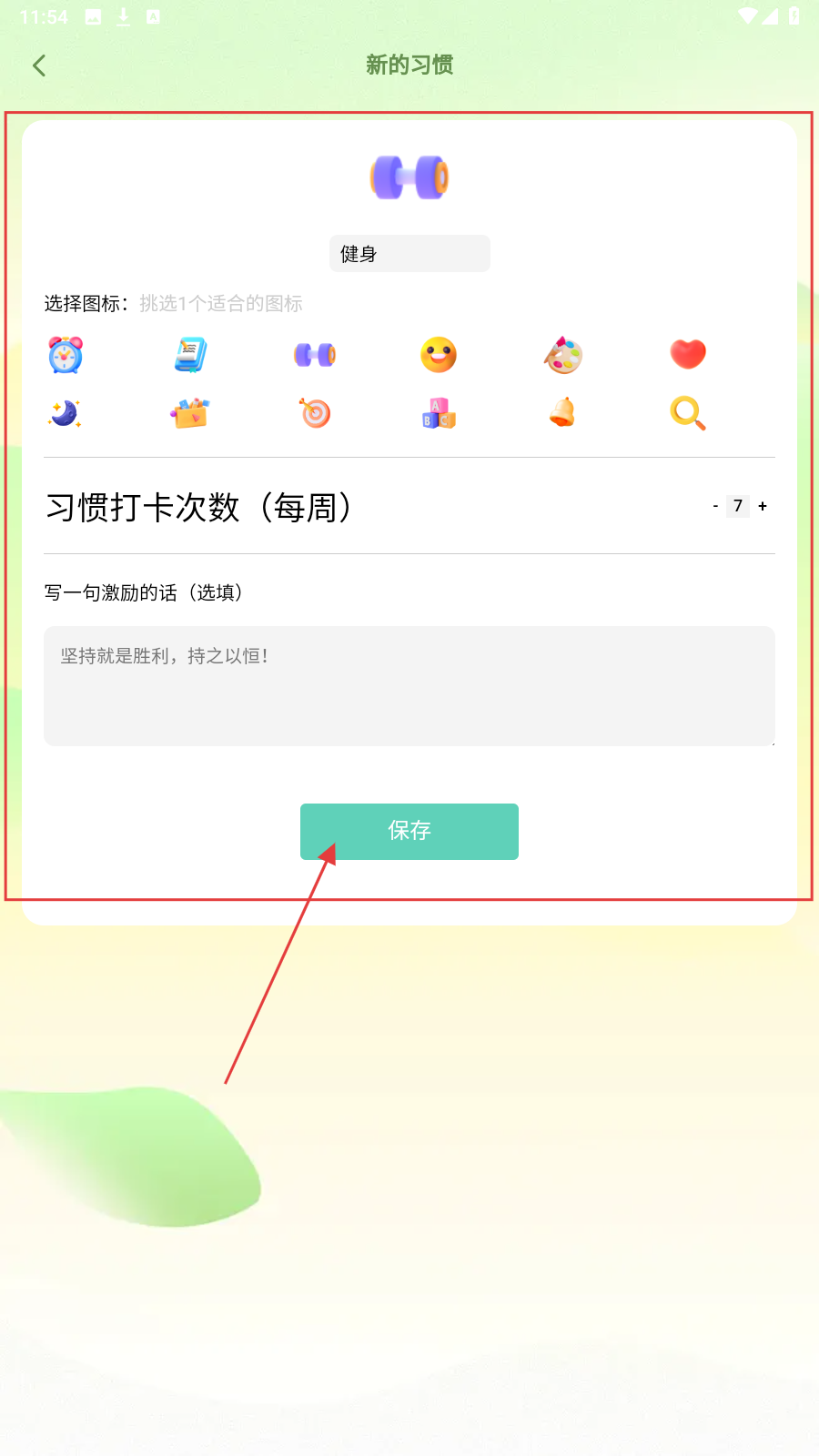 2、在【新的习惯】页,选图标、设打卡次数、写激励语,点【保存】完成创建。