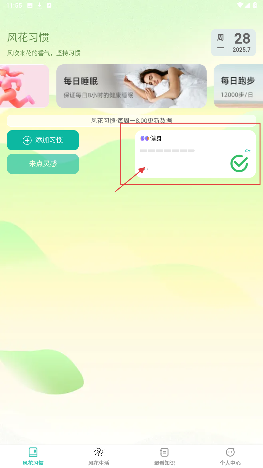 3、返回【风花习惯】页,可查看新增的【健身】习惯卡片,跟踪打卡进度。