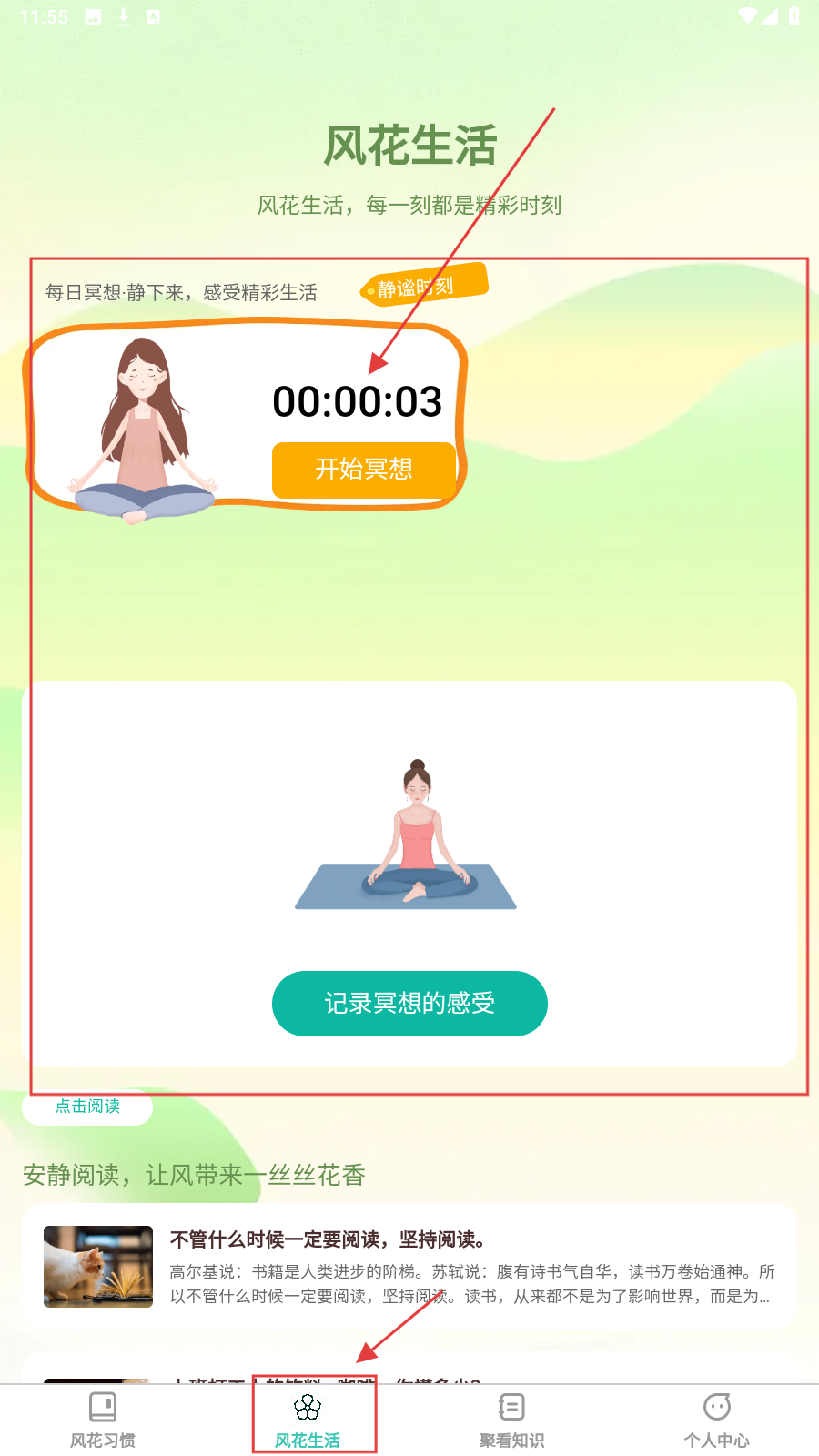 4、切换到【风花生活】页,点击【开始冥想】按钮,参与冥想活动记录感受。