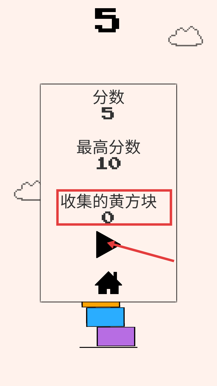 4、游戏结束后,可查看本次分数、最高分数和收集的黄方块数量,点击重新开始按钮可再次挑战。