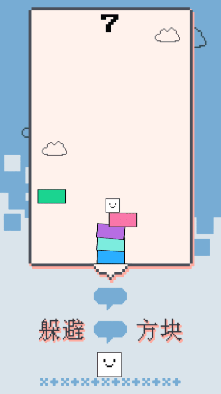 2、控制小方块向上弹跳,收集途中的黄色小方块,同时注意躲避障碍物。