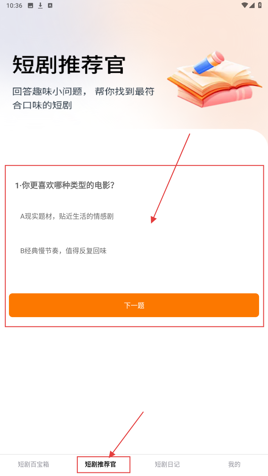 1、打开应用,在【短剧推荐官】页面,按照自身情况选择答案。
