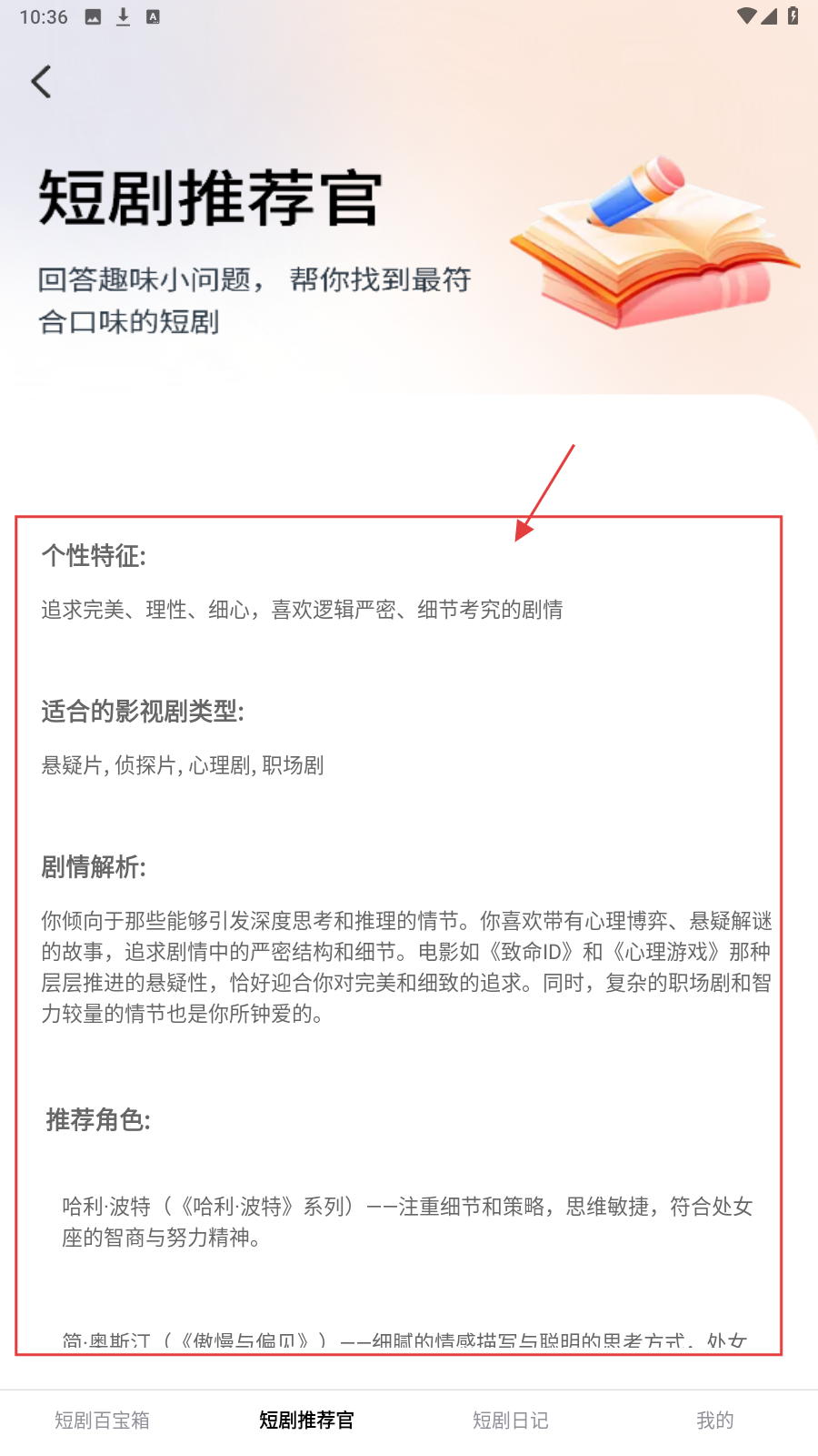 2、做完题目后查看生成的结果,了解个性特征、适合的影视剧类型等,获取专属推荐。