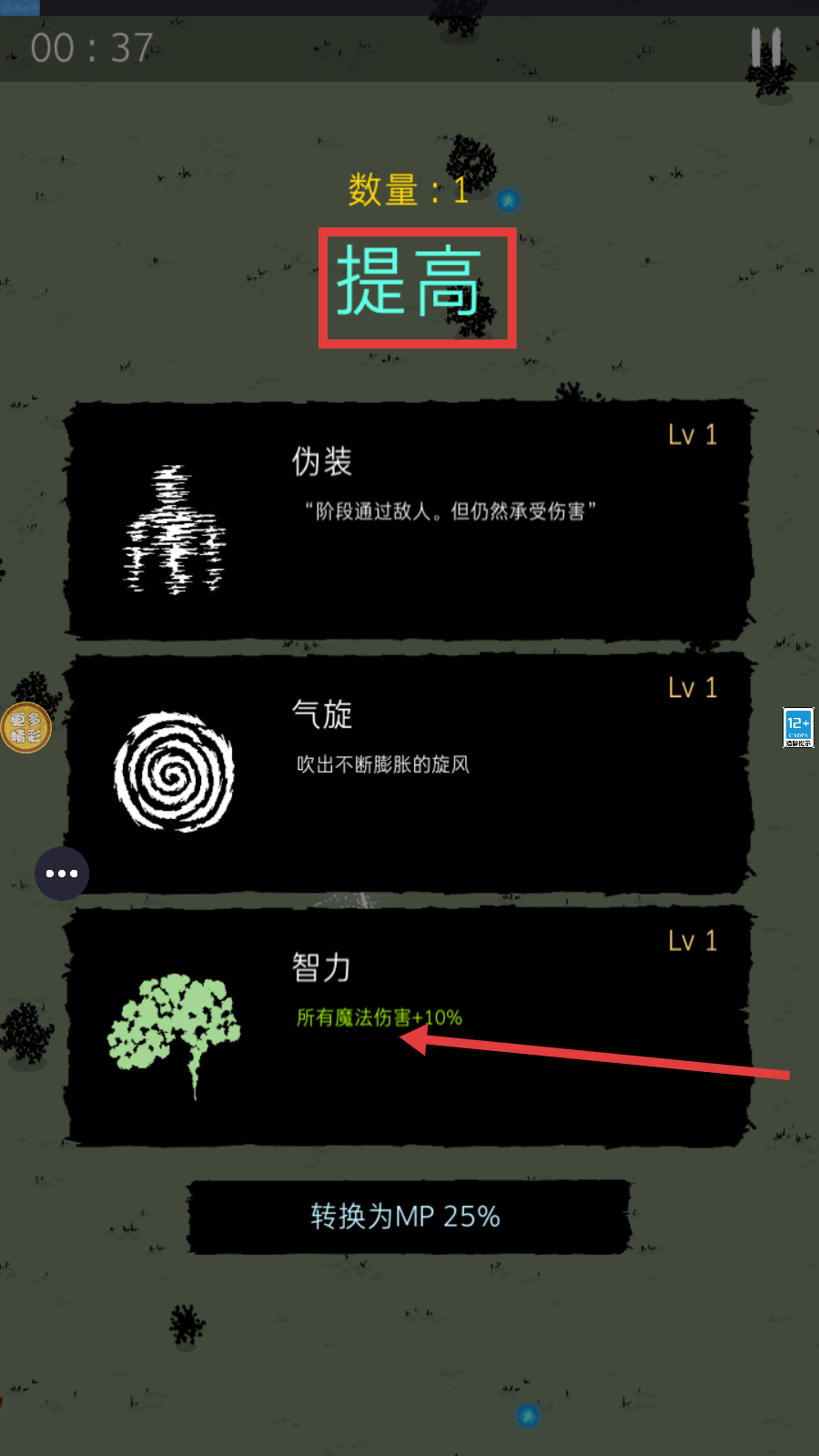 3、当出现技能选择界面时,可根据需求选择“伪装”“气旋”“智力”等技能进行升级,提升角色能力。