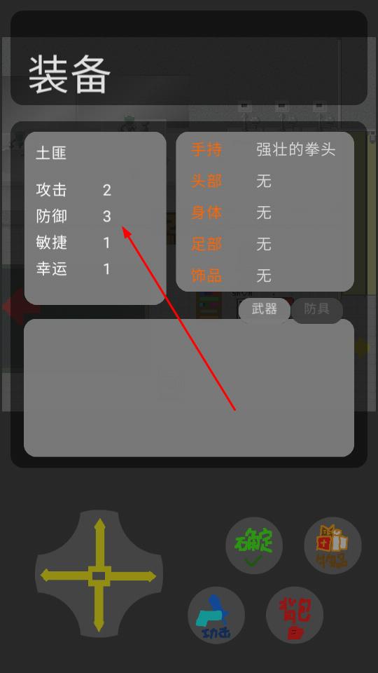 3、打开装备界面,查看角色土匪属性:攻击2、防御3、敏捷1、幸运1,手持强壮的拳头,头部、身体等部位暂无敌具,根据属性规划战斗策略。