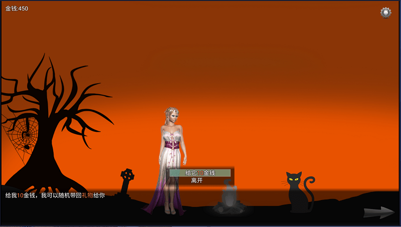 2、操控角色如穿长裙的女性角色移动,靠近篝火、墓碑等场景元素依红色箭头指引方向,探索地图、收集资源如金钱从1200变为1300。