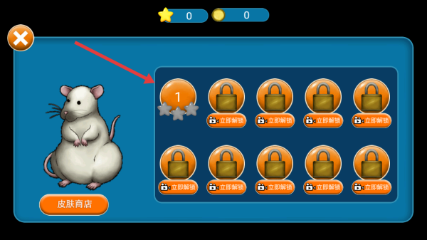 1、皮肤商店界面里,找到带灰色星星标识的1号老鼠皮肤,满足解锁条件后选定,配置外观后返回关卡选择列表。