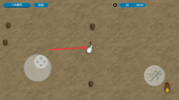 3、通过左侧虚拟摇杆控制老鼠移动,躲避蚂蚁等障碍,沿着场景路径推进,收集目标、完成关卡设定任务。