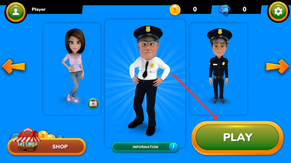 1、主界面选警察角色,点击PLAY进入关卡页,选绿色1号关卡,开启城市跑酷挑战流程。