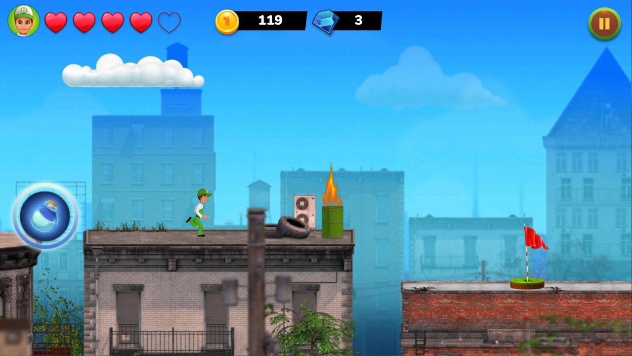 2、敌人类型多样:拦路敌人有骑行的捣蛋鬼、抛扔杂物的路人,每种敌人移动节奏不同,比如骑行者需跳至其上方踩踏才能击退,增加应对趣味。
