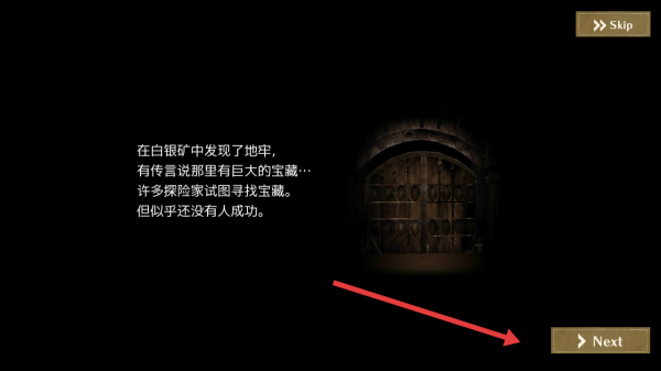 1、点击Next按钮,确认白银矿地牢藏宝藏的剧情,进入冒险场景,正式开启地牢探索之旅。