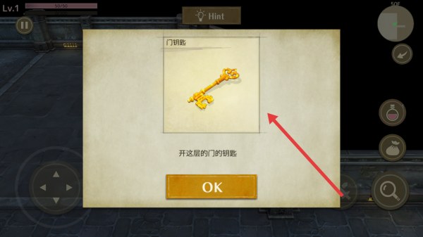 2、获取门钥匙道具,查看提示信息,用左侧摇杆操控角色移动,寻找可开门的区域位置。