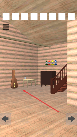 2、操控视角在木屋内探索,留意吉他、桌椅等物品,互动尝试收集道具,结合窗外数字,寻找可破解的机关、门锁或暗格。