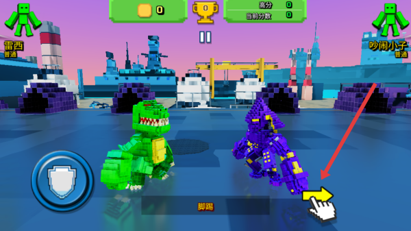 3、战斗中操控雷西,先右滑动哦们使用脚踢技能,攻击紫色吵闹小子,灵活运用左侧防御按钮争取获胜。