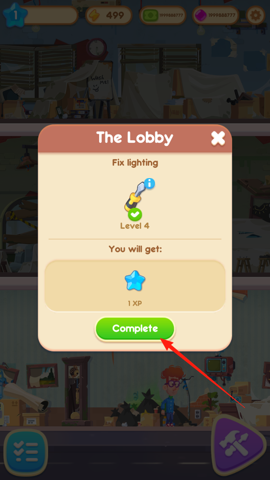 1、点击Complete完成任务,修复大堂照明获取经验,提升建筑等级,体验任务结算机制。