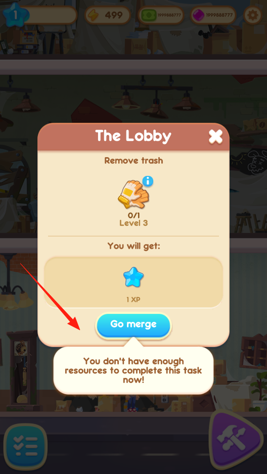 2、点击Go merge尝试合并,因资源不足无法完成清理,需收集材料推进任务流程,体验资源限制玩法。