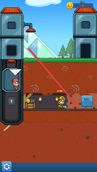 2、点击矿工来挖矿,矿工升级等级1后效率提升,遇到金币堆或者宝箱优先挖,雇新工人红帽子。