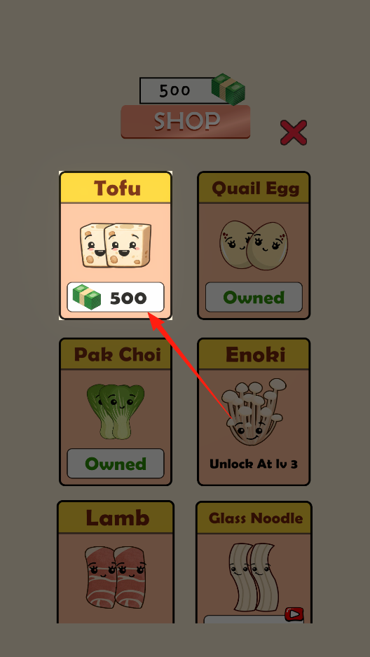 2、进入商店购买食材,点击Tofu消耗资金,扩充食材库,为制作餐品准备,体验食材采购玩法。