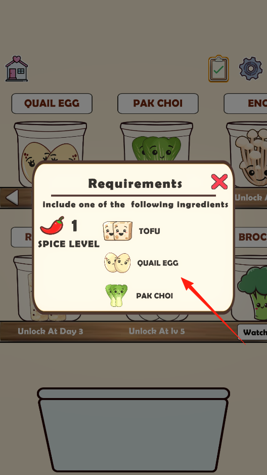 3、查看订单要求选择食材,根据需求,搭配豆腐鹌鹑蛋等,满足spice level,体验订单制作机制。