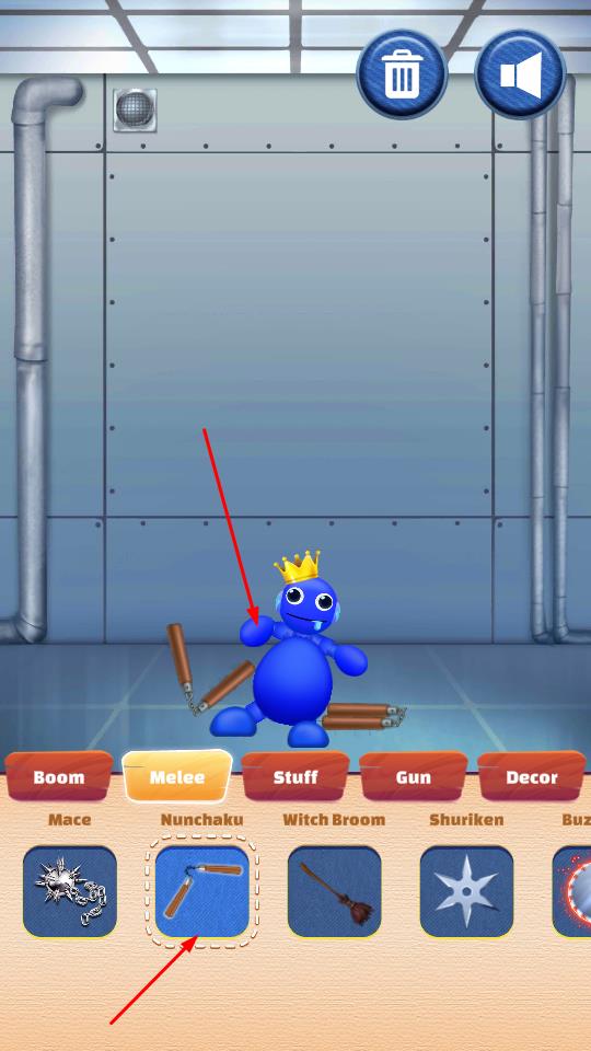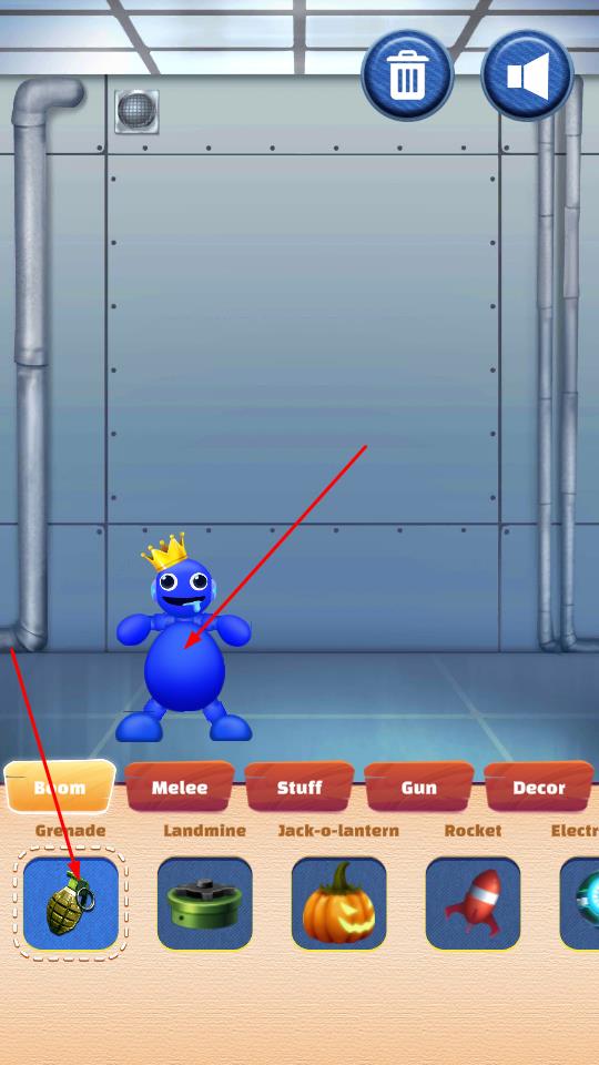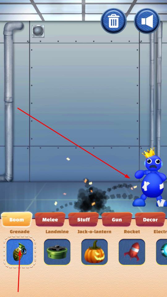 1、进入游戏界面,在下方分类栏选Boom类道具,如点击Grenade手雷,将其拖至蓝色戴皇冠角色处,触发互动效果。