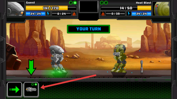 2、在战斗回合中,按照箭头指示点击绿色箭头选定己方机甲,再点武器按钮对敌方HeatBlast机甲攻击。