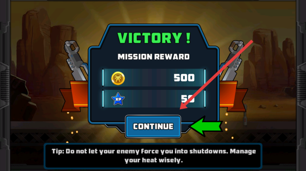 3、胜利后在结算界面,可以点击CONTINUE按钮,领取500金币与50XP奖励,继续后续机甲战斗。