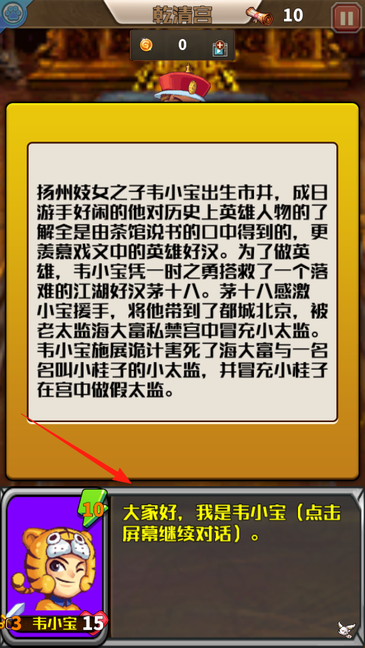 1、点击角色对话推进剧情,阅读韦小宝背景,了解故事设定,开启宫廷冒险,体验叙事互动机制。