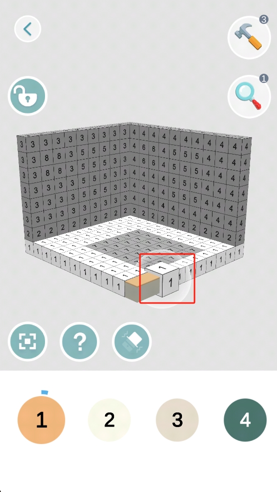 1、观察3D方块数字布局,拖动标注1的方块,依据周围数字提示,嵌入对应位置,逐步拼接方块结构,完成初始拼图搭建。