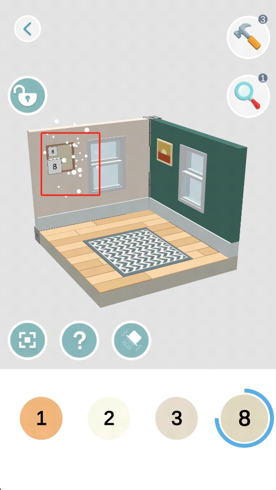 2、找到标有数字8的墙上门牌,结合下方数字8的道具,点击互动,解锁房间隐藏内容,推进解谜。