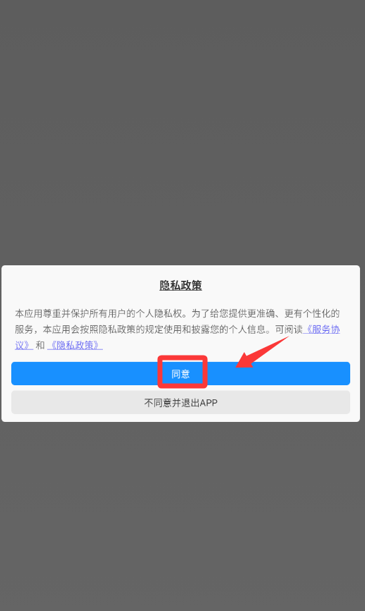 1、点击隐私政策红色框框的同意并进入。