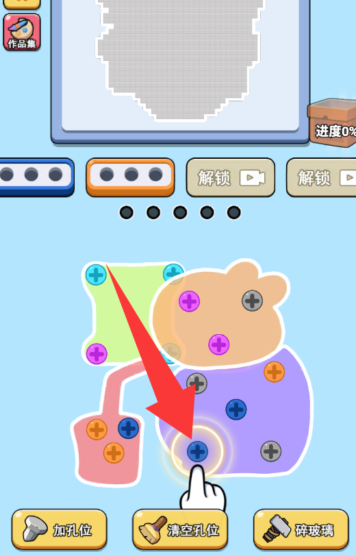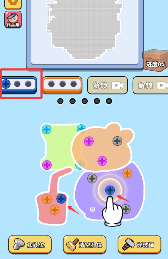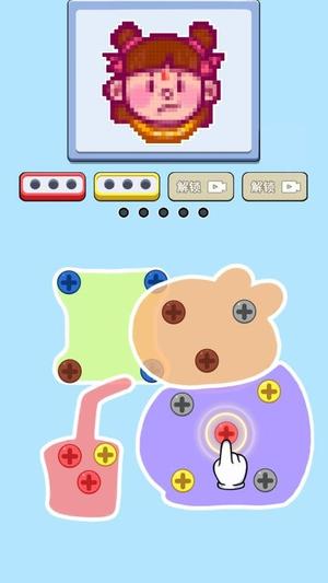 1、通过点击选择同色螺丝组,滑动完成拆除操作。每拆除一组螺丝会显露部分底图,最终拼出完整图案即为通关。